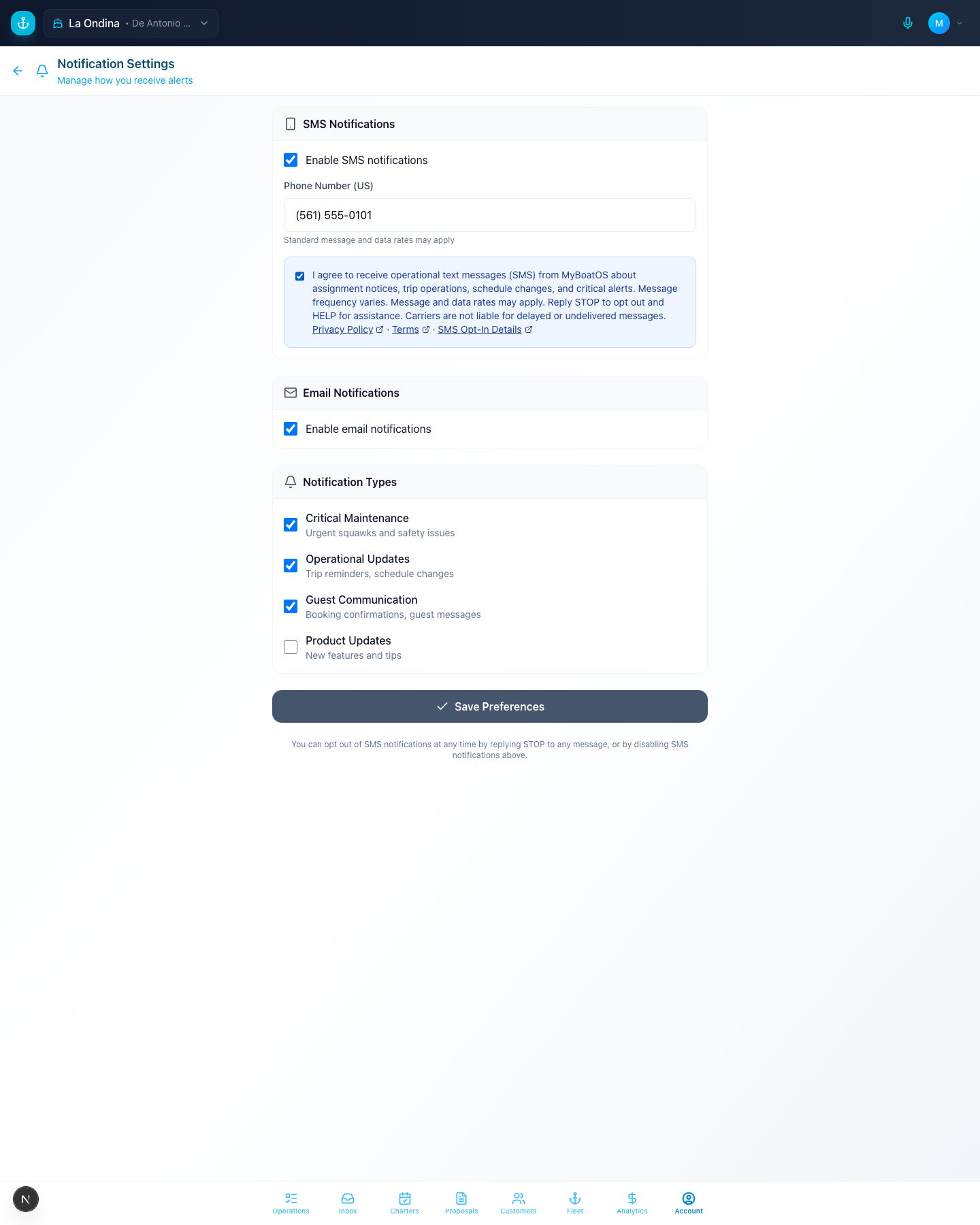 MyBoatOS sends transactional SMS only. Current primary recipients are operators, captains, and crew using authenticated MyBoatOS workflows.